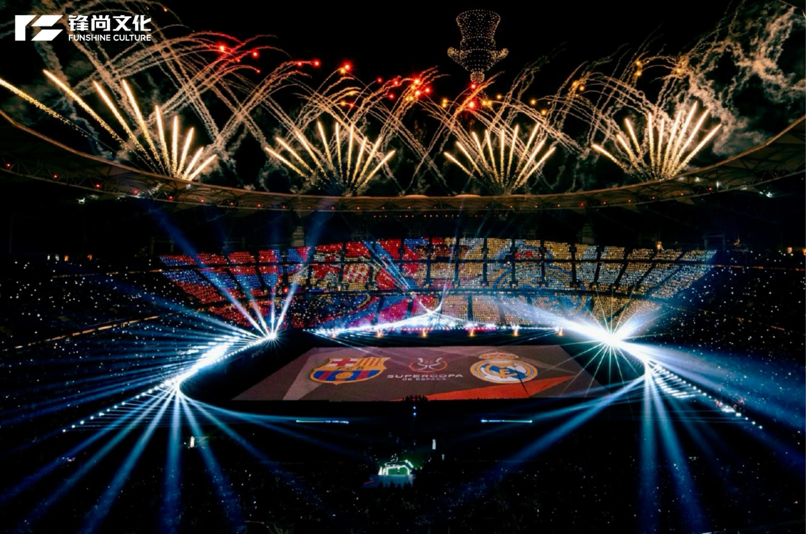 锋尚文化的“出海”步伐从未停歇。沙特吉达的夜空下,锋尚文化于2026年西班牙超级杯完成惊艳首秀。在阿卜杜拉国王体育场,六万目光汇成星河,注视巴萨与皇马的巅峰对决。光影为笔,足球为魂,一场盛典在地面投影、立面点阵与空中无人机的层层递进中升腾,织就天地联通的视觉诗篇。