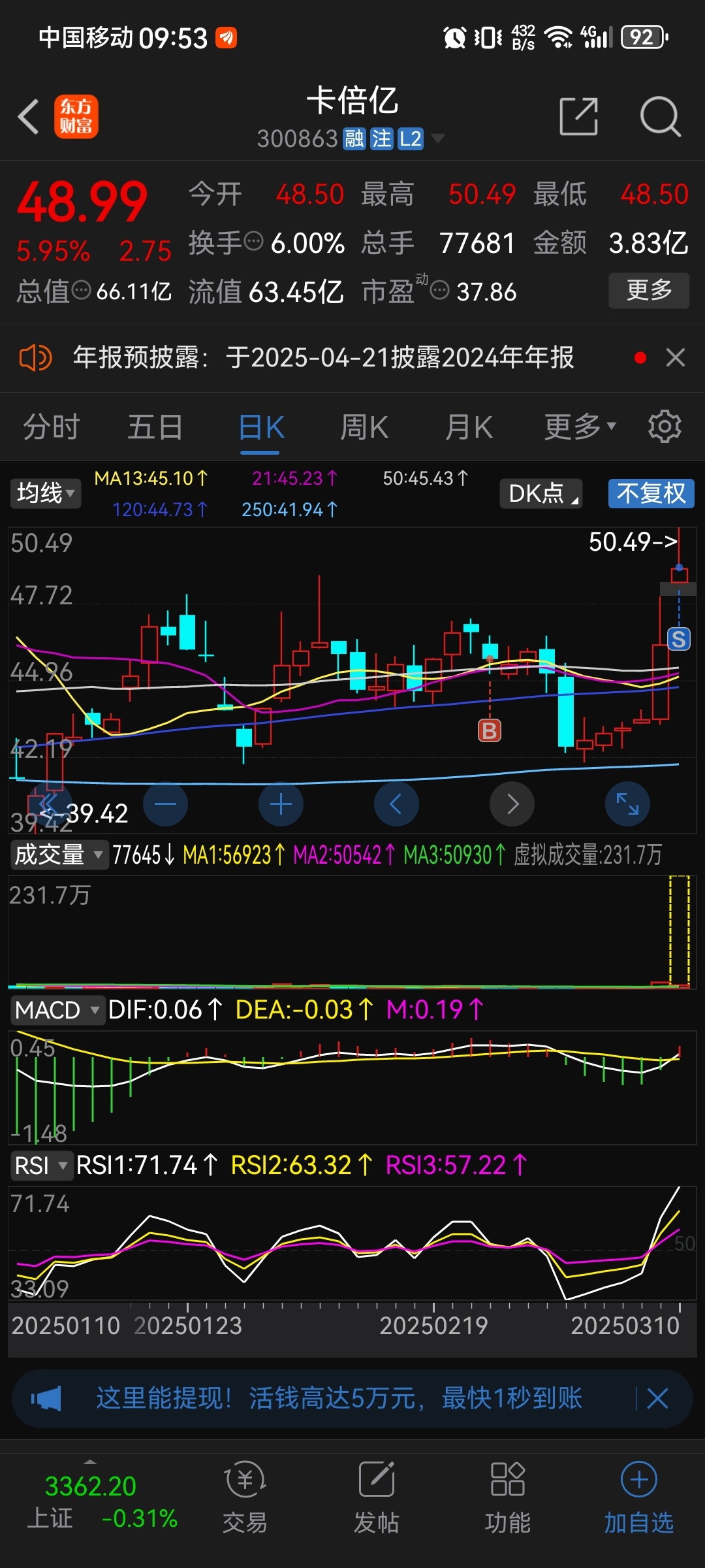 $卡倍亿(SZ300863)$ 赚五个点,先走了,留下的发财