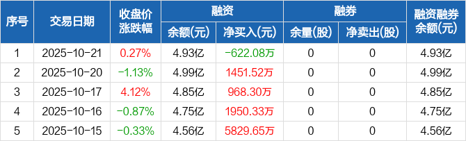 卡倍亿:融资净偿还622.08万元,融资余额4.93亿元(10-21)