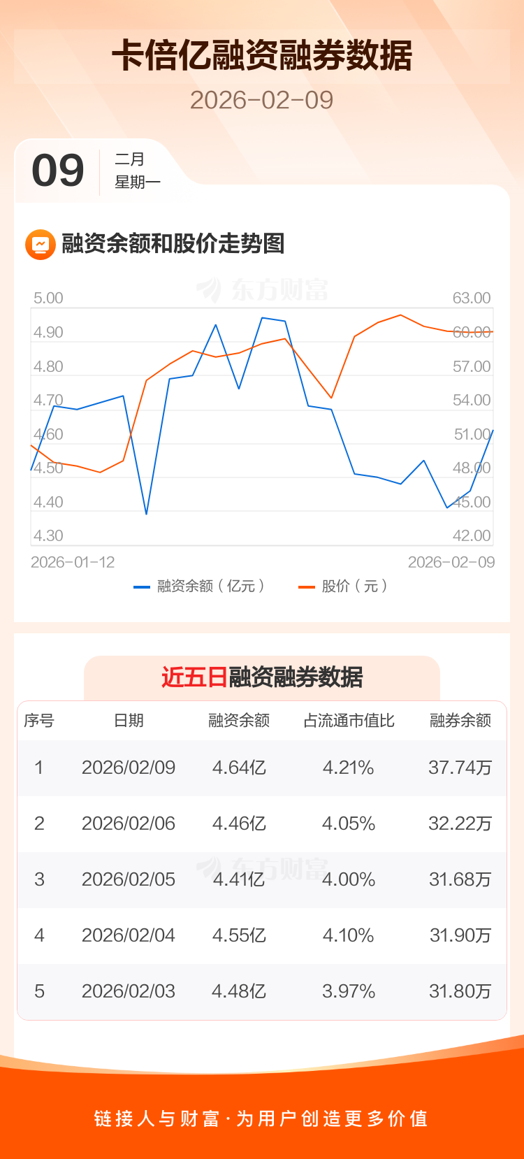 交易所最新数据显示,卡倍亿于2026年2月9日获融资买入5024.14万元,融资偿还3201.19万元,当日融资净买入1822.95万元。目前,该股融资余额4.64亿,占流通市值比例为4.21%。