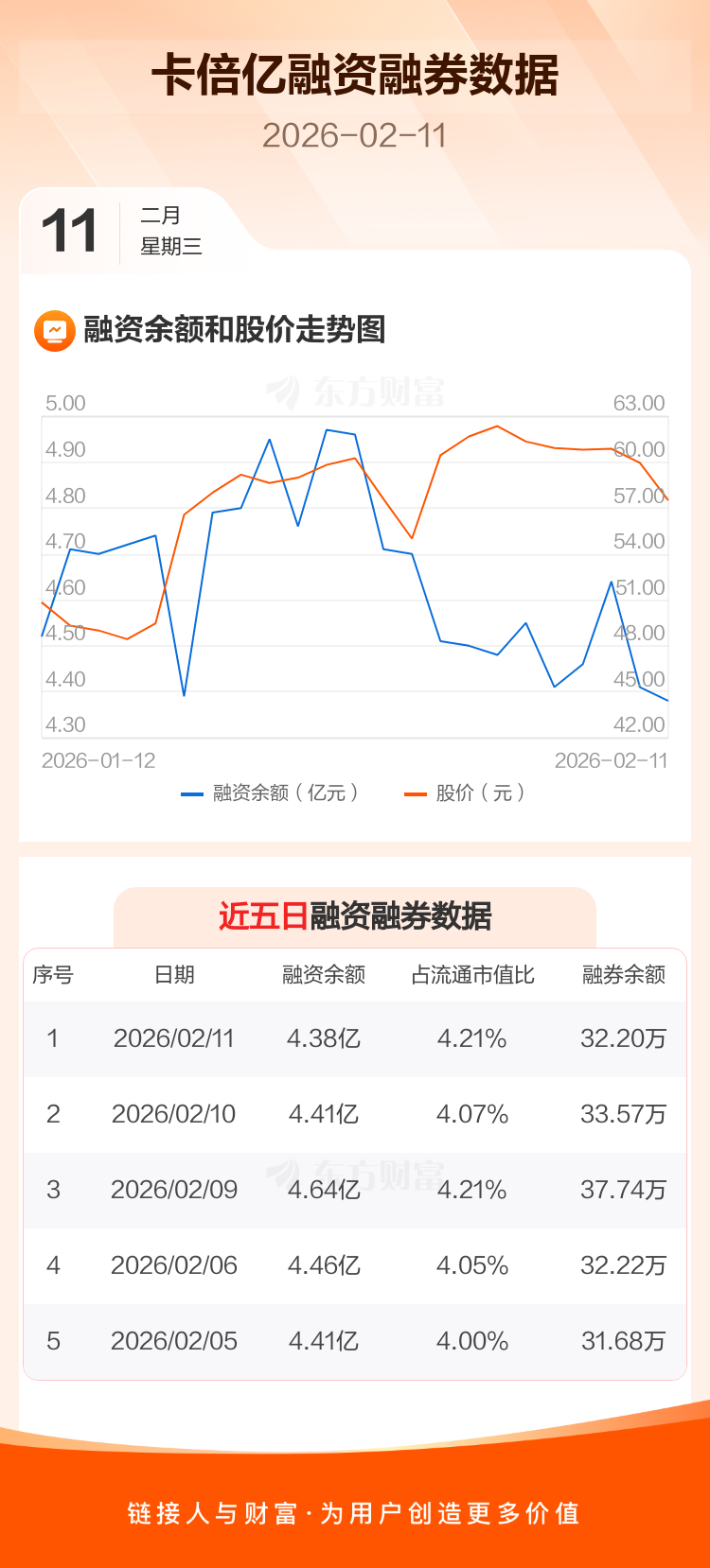 交易所最新数据显示,卡倍亿于2026年2月11日获融资买入2804.64万元,融资偿还3139.80万元,当日融资净偿还335.16万元。目前,该股融资余额4.38亿,占流通市值比例为4.21%。