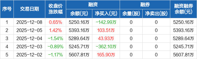 南大环境:融资净偿还142.99万元,融资余额5250.16万元(12-08)