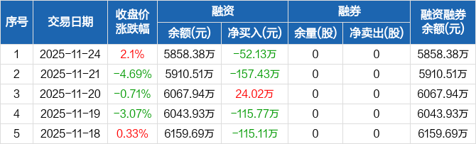 大宏立:融资净偿还52.13万元,融资余额5858.38万元(11-24)