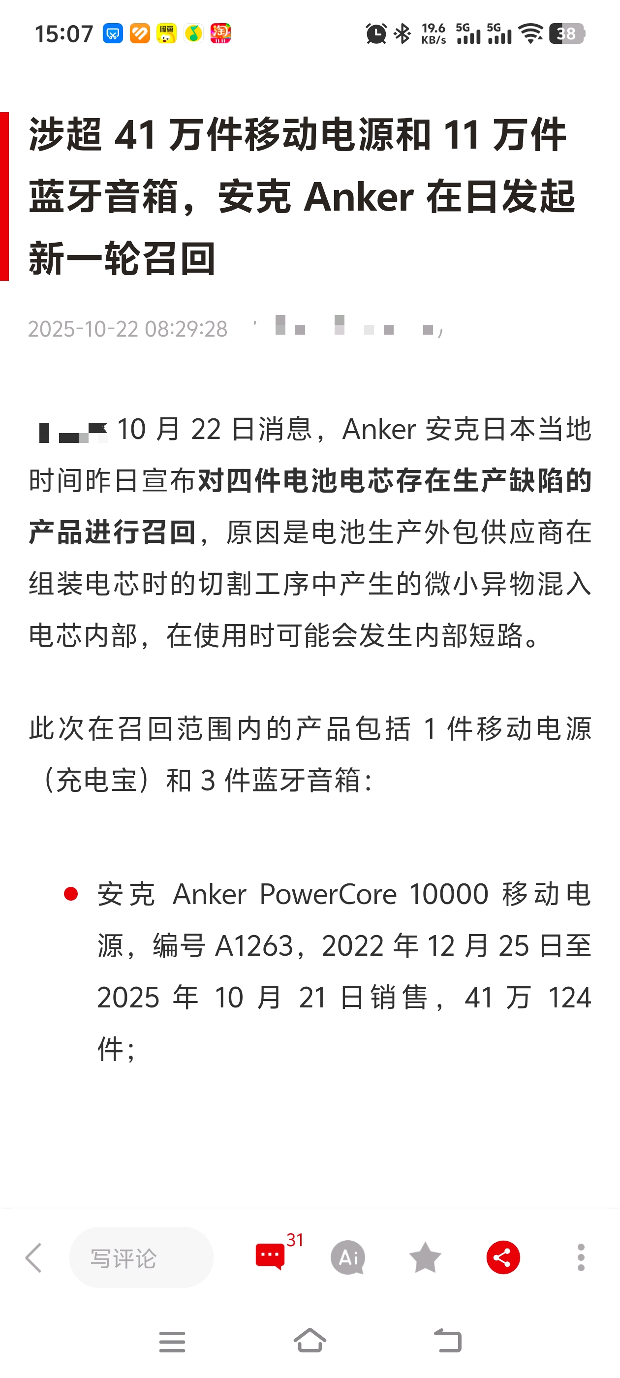 安克继续召回数十万件充电宝、蓝牙音箱等产品