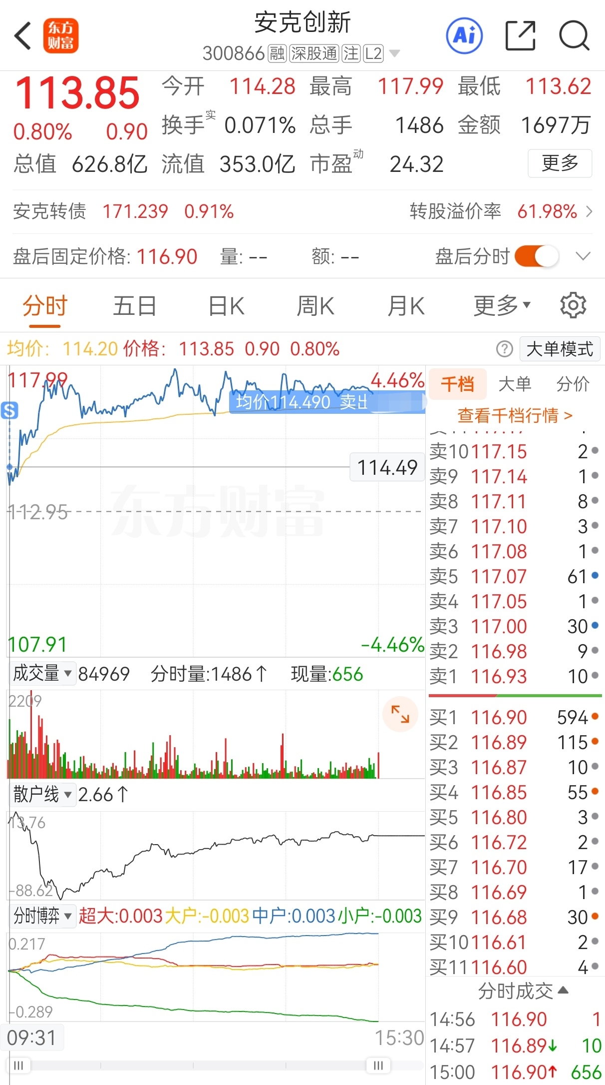 $安克创新(SZ300866)$ 今买明卖,112.95买,114.49卖,实盘隔夜套利安克创新,成功收米走人!