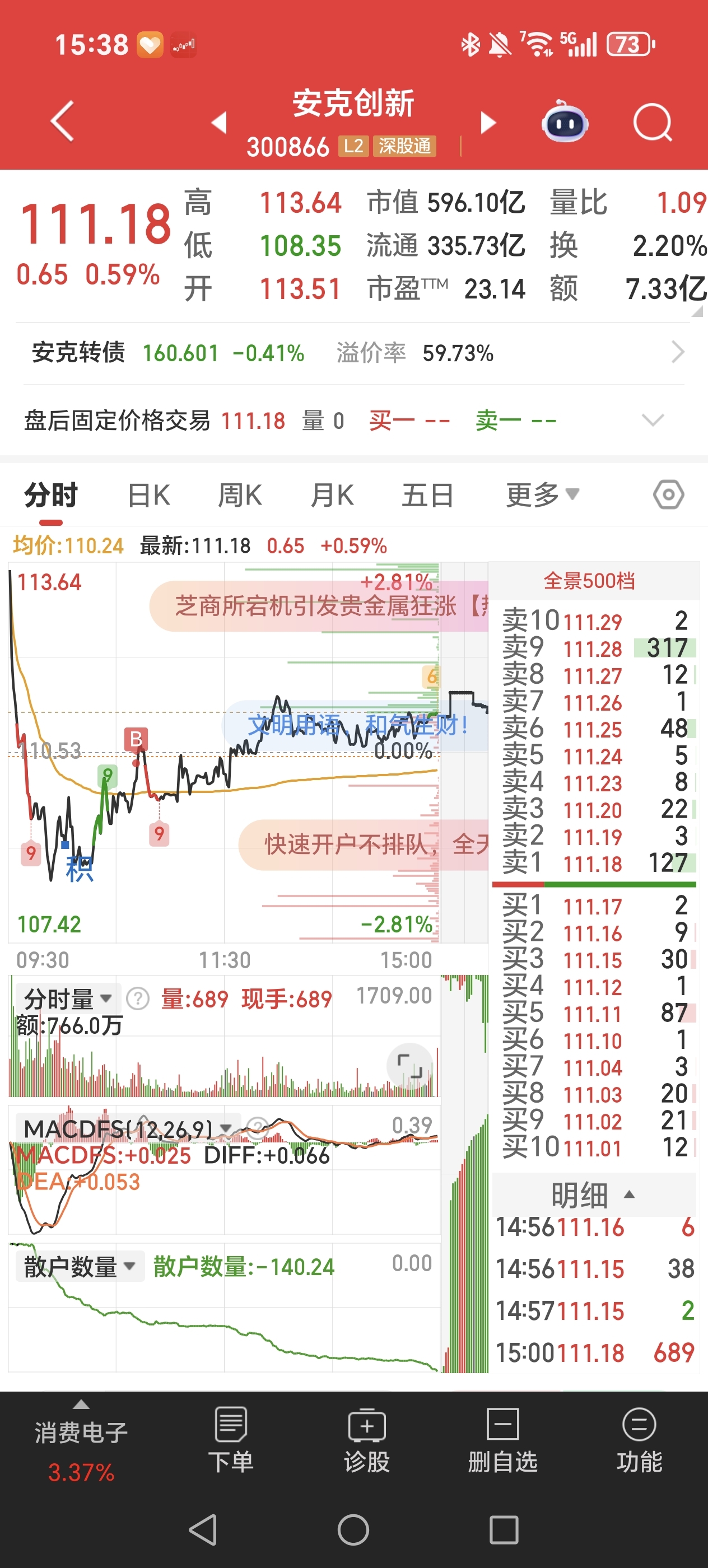 $安克创新(SZ300866)$ 今天为什么高开这么多?上周四清的,周五的107挂单没买进去,今天上午接回来些,今天走势看着不像出货