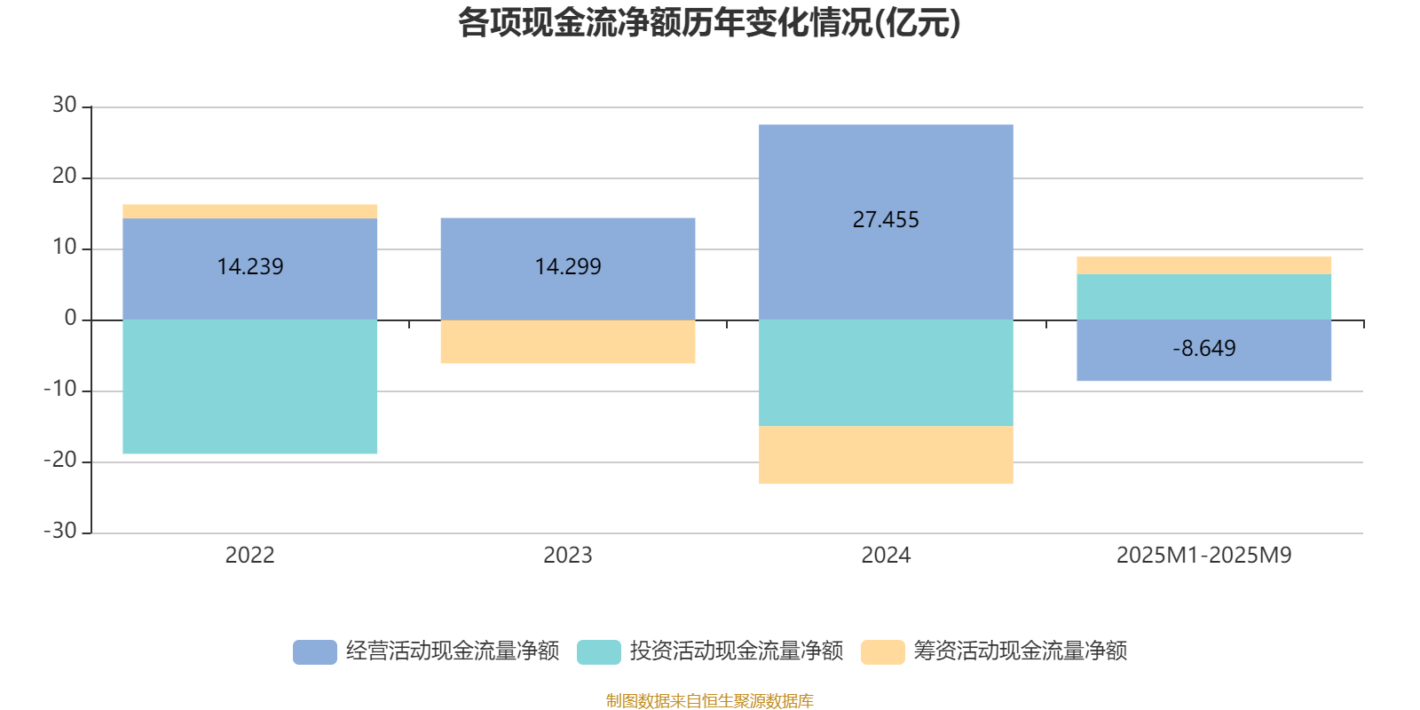 2025年1月至9月,公司经营活动现金流净额为-8.65亿元,同比减少25.16亿元;筹资活动现金流净额2.43亿元,同比增加10.76亿元;投资活动现金流净额6.44亿元,上年同期为-7.95亿元。