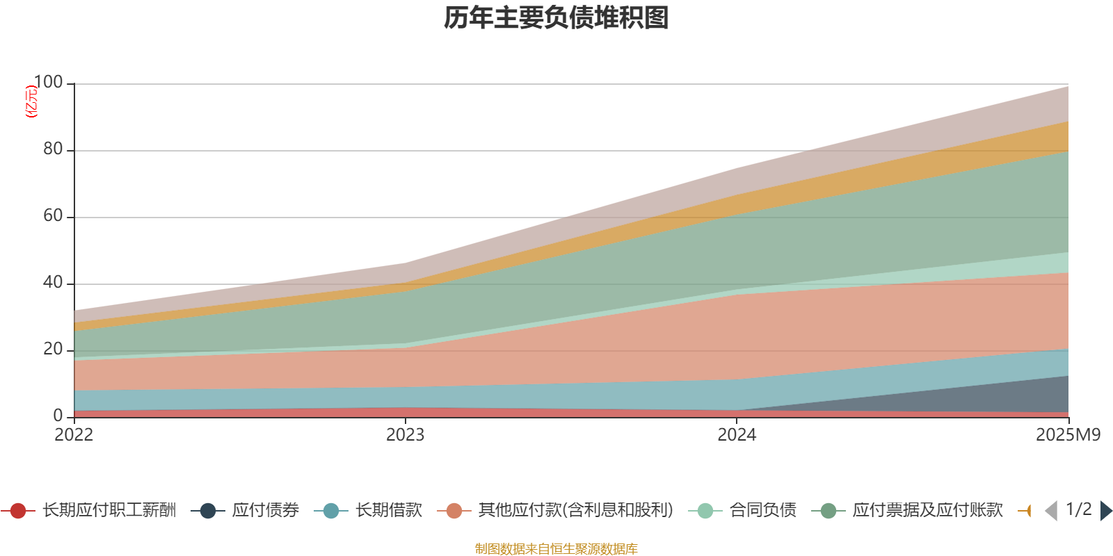 负债重大变化方面,截至2025年9月,公司应付债券占公司总资产的5.45%,上期末为0;其他应付款(含利息和股利)较上期末减少10.34%,占公司总资产比重下降3.93个百分点;合同负债较上期末增加293.17%,占公司总资产比重上升2.11个百分点;应付票据及应付账款较上期末增加34.39%,占公司总资产比重上升1.55个百分点。