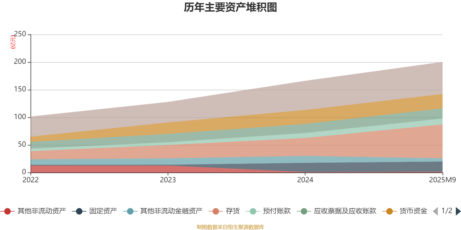 资产重大变化方面,截至2025年9月,公司存货较上期末增加90.11%,占公司总资产比重上升11.23个百分点;其他非流动金融资产较上期末减少53.35%,占公司总资产比重下降4.69个百分点;货币资金较上期末增加2.28%,占公司总资产比重下降2.32个百分点;使用权资产较上期末增加158%,占公司总资产比重上升0.8个百分点。