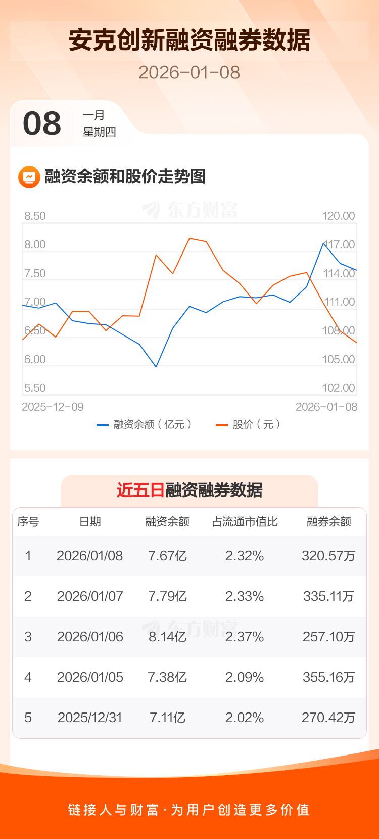 交易所最新数据显示,安克创新于2026年1月8日获融资买入5705.79万元,融资偿还6982.60万元,当日融资净偿还1276.81万元。目前,该股融资余额7.67亿,占流通市值比例为2.32%。