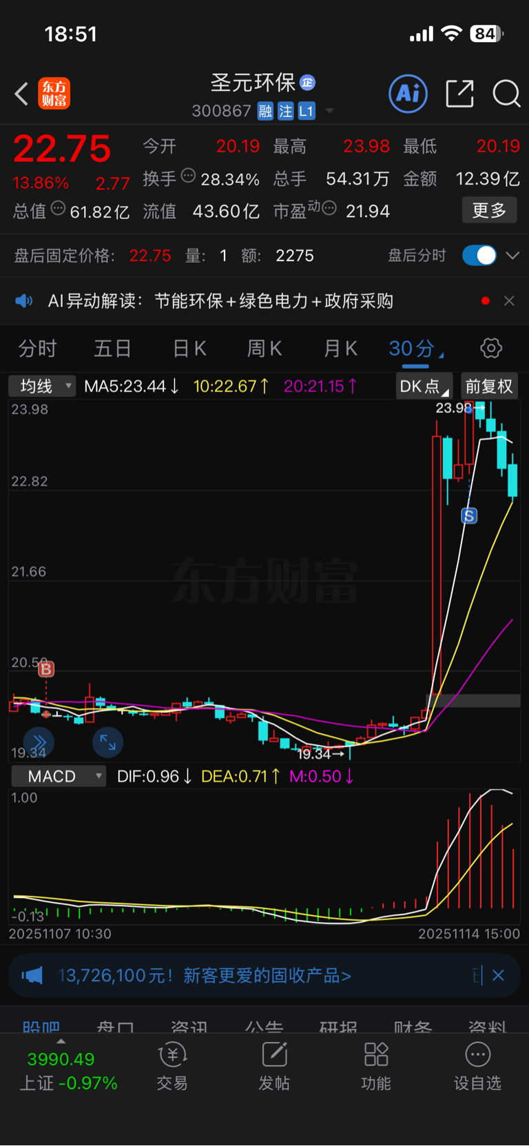 $圣元环保(SZ300867)$ 谢谢主力,虽然今天只吃了19.5%,但我知足了。后市应该还会涨,但是不知道你会不会又回到19,20。所以,有赚我就先出来了,如果没机会买回来,我依然祝福你,不敢贪了