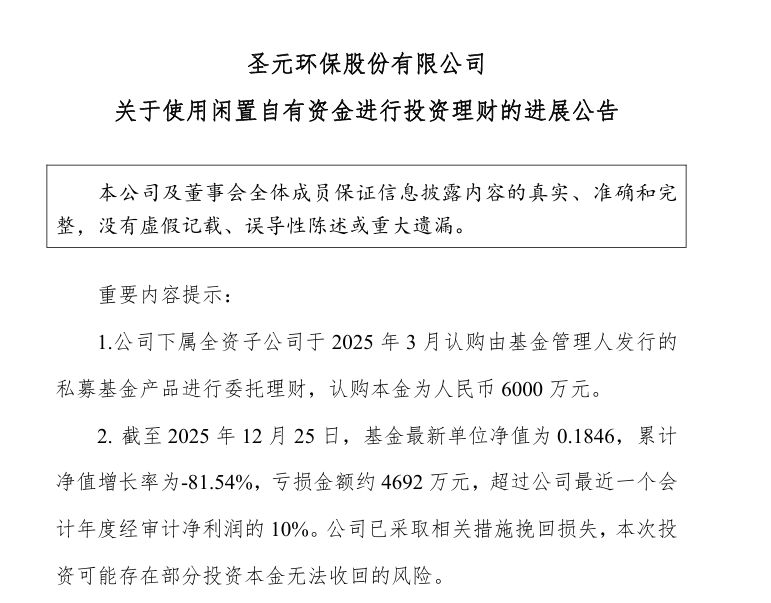 12月26日,圣元环保(300867.SZ,股价19.69元,市值53.51亿元)公告称,公司全资子公司厦门金陵基建筑工程有限公司于2025年3月认购私募基金产品,认购本金6000万元。截至2025年12月25日,该基金累计净值增长率为-81.54%,亏损金额约4692万元,超过公司最近一个会计年度经审计净利润的10%。