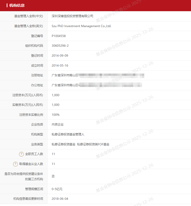 公开资料显示,深博信投成立于2014年,注册资本为1000万元,全职员工11人,管理规模区间为0~5亿元。