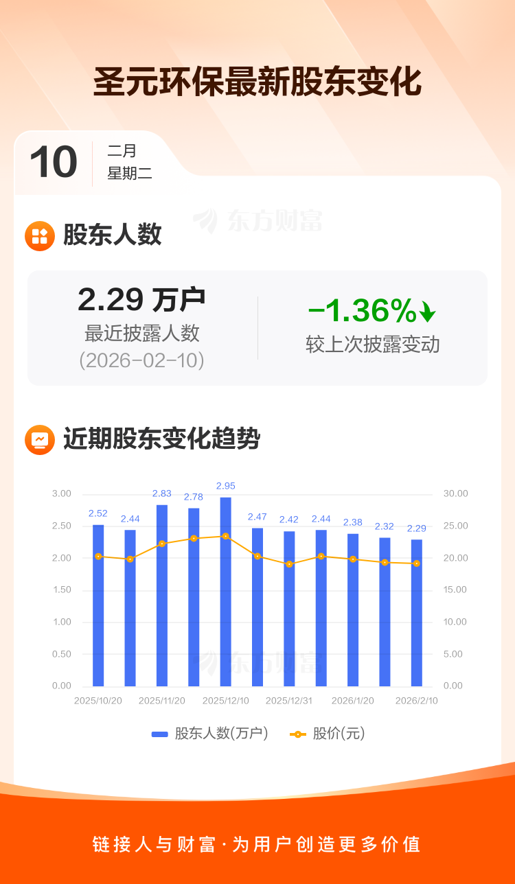 圣元环保:截至2月10日最新股东户数2.29万户,较上期减少1.36%