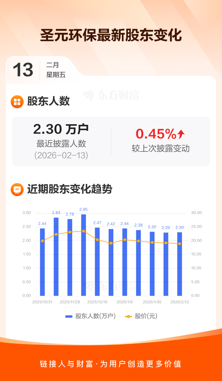 圣元环保:截至2月13日最新股东户数2.30万户,较上期增加0.45%