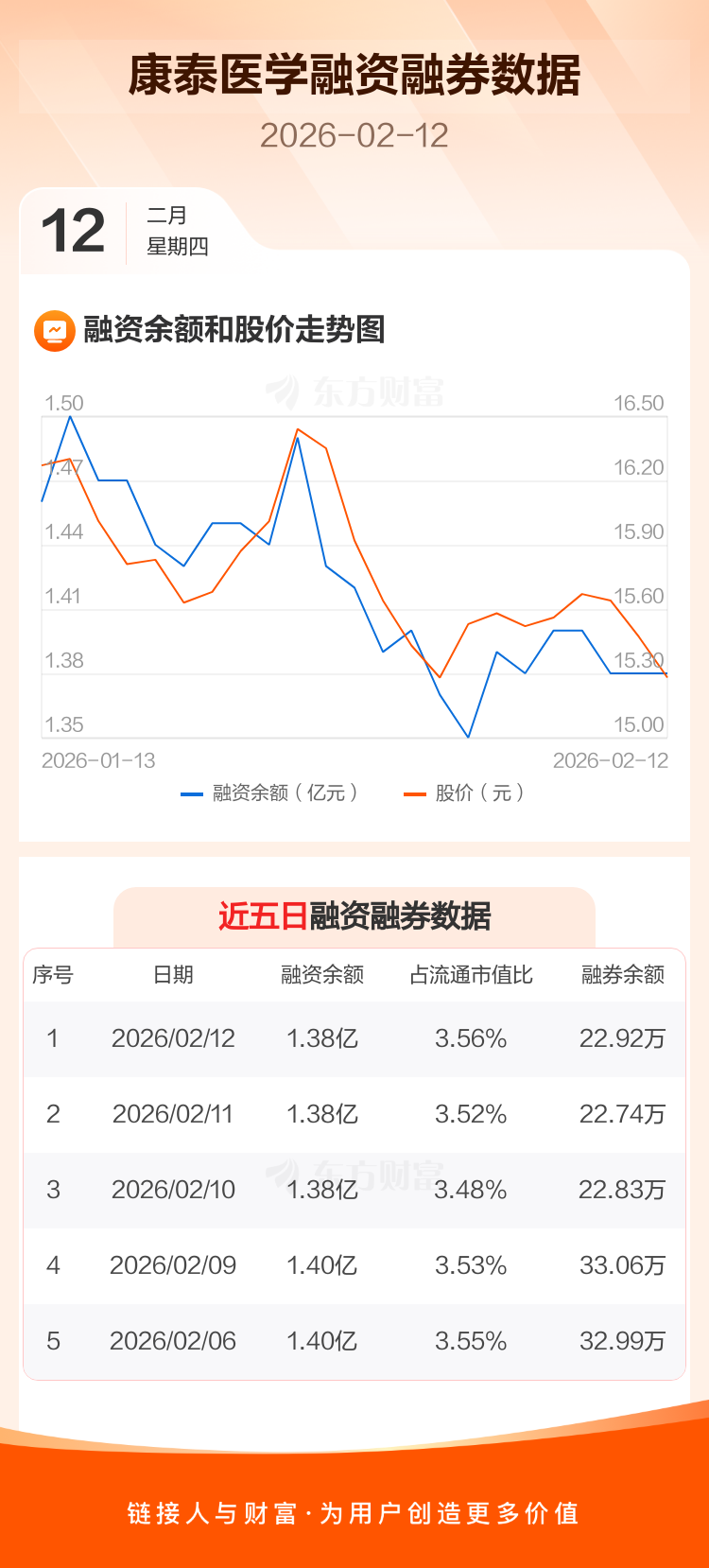 交易所最新数据显示,康泰医学于2026年2月12日获融资买入329.57万元,融资偿还326.46万元,当日融资净买入3.11万元。目前,该股融资余额1.38亿,占流通市值比例为3.56%。