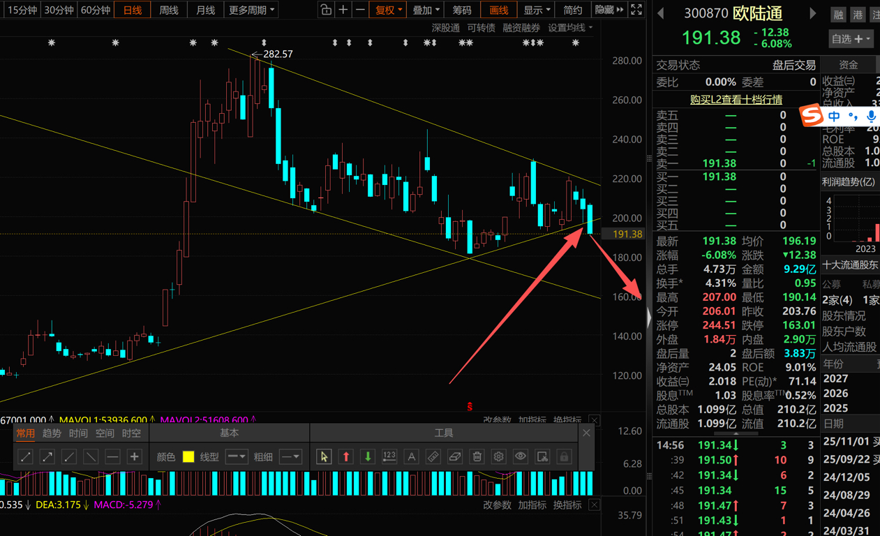 $欧陆通(SZ300870)$ 彻底凉凉,跌破上升趋势线,走入下降通道,这个股废了,160见。