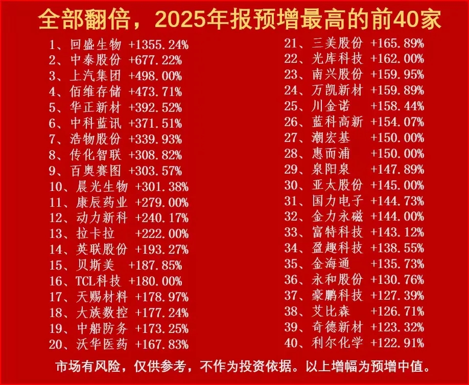 2025年报业绩预增前40名一览!$回盛生物(SZ300871)$ #周末杂谈#