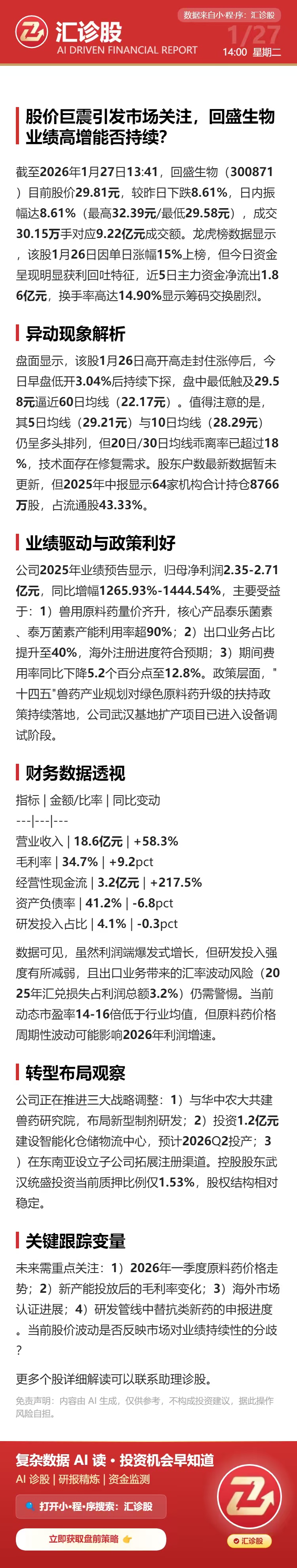 股价巨震引发市场关注,回盛生物业绩高增能否持续?