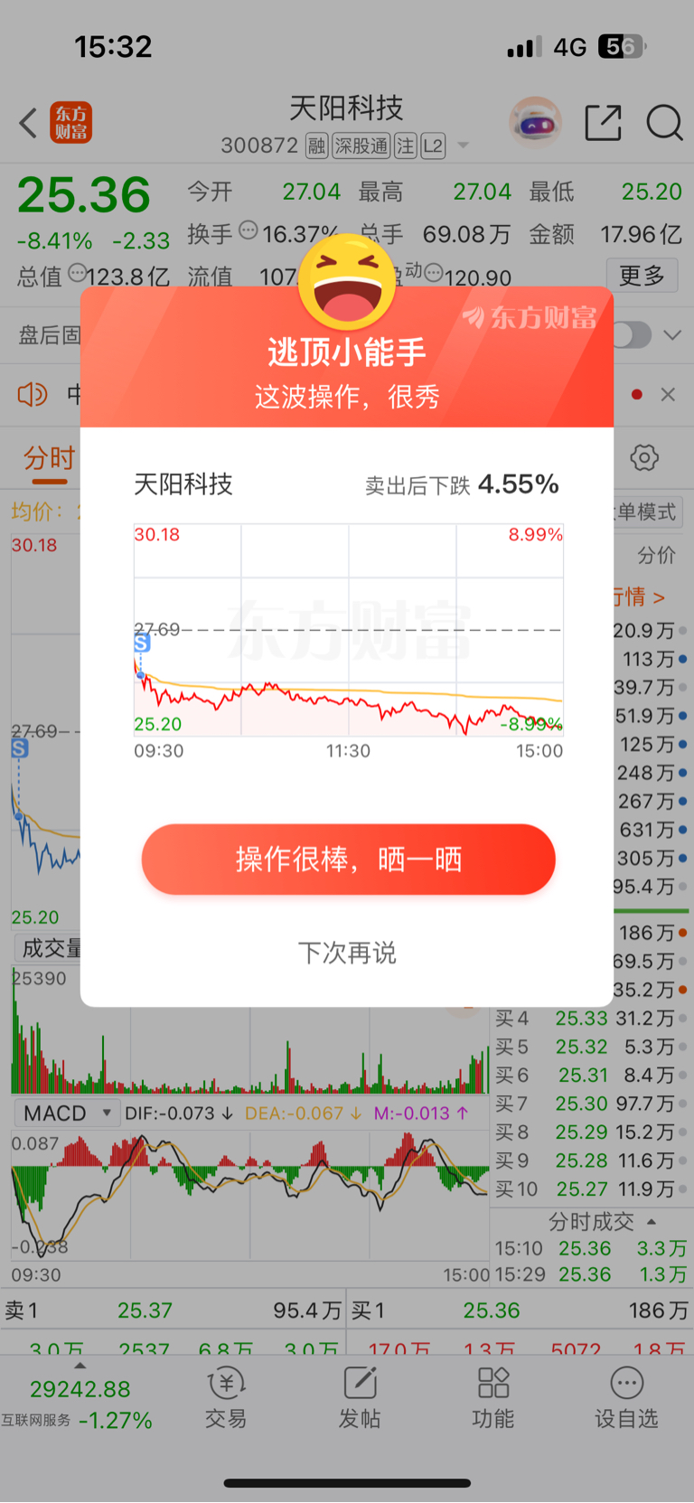 $天阳科技(SZ300872)$ 已清仓,早上犹豫了两分钟,导致多亏了两个点,这是对本金的不尊重,要自我反省,后续不再关注此票,已水下低吸德福科技,明天有望走加速,贴吧里有同吸德福科技的吗?