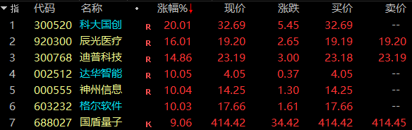 创业板8只涨停个股,尾盘涨停科大国创,是量子科技题材,晨光医疗、迪普科技、达华智能、神州信息、国盾量子、富士达均是尾盘开始发力的。