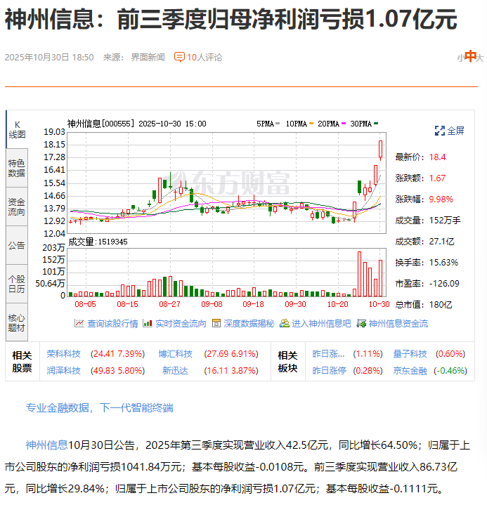 哪有天理?六天三板,今日连板:神州信息前三季度归母净利润亏损1.07亿元。