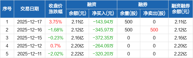 海晨股份:连续5日融资净偿还累计1446.55万元(12-17)