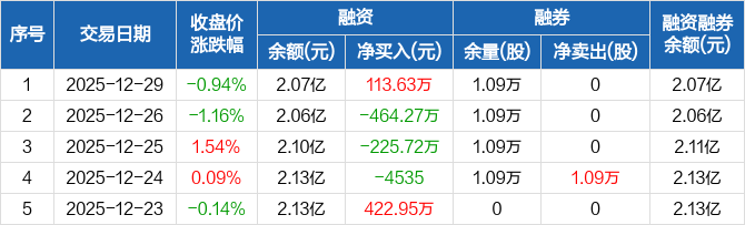 海晨股份:融资净买入113.63万元,融资余额2.07亿元(12-29)