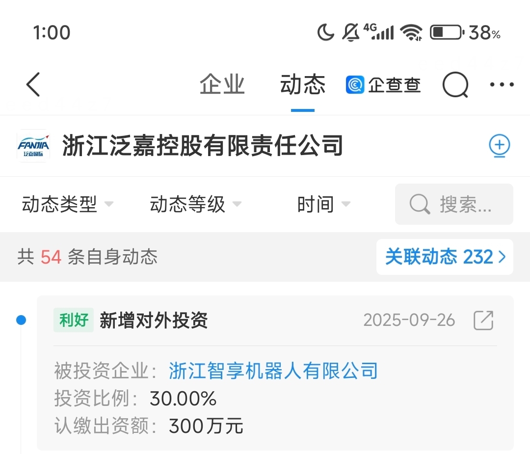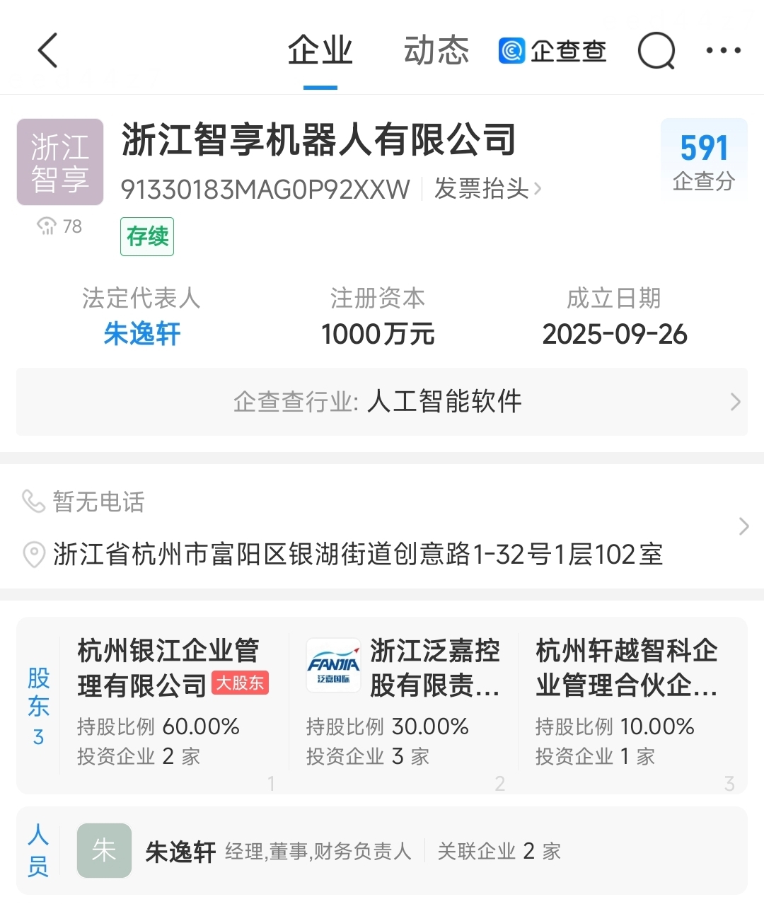 2. **生态伙伴协同**:浙江泛嘉控股有限责任公司(杨隐峰持股52.25%)以30%持股比例战略投资浙江智享机器人,认缴300万元。泛嘉控股作为小微咨询企业,或为机器人产品的商业化落地提供场景资源(如企业健康管理、智慧园区应用)。