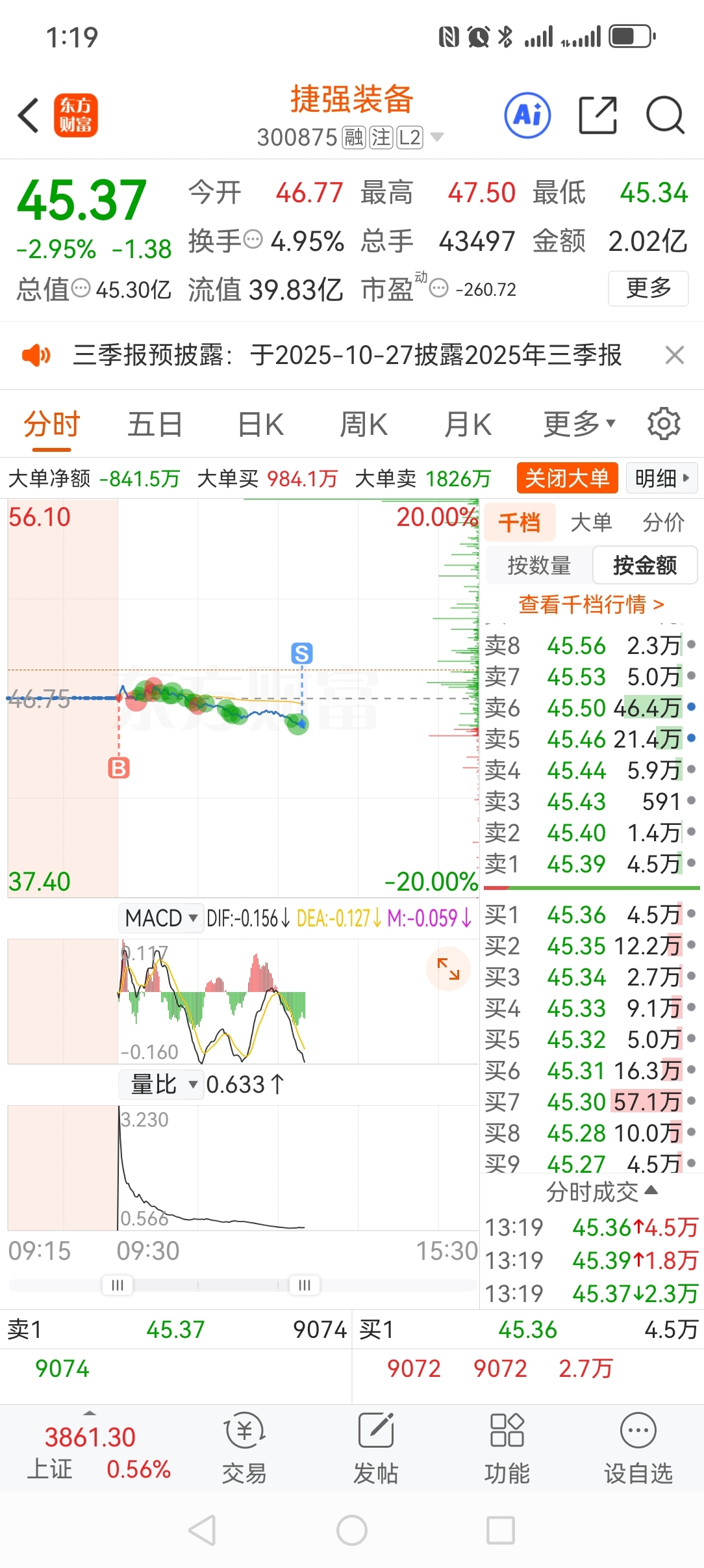 $捷强装备(SZ300875)$ 的,做一个反T,已经跌破十日线了,明天再不涨得清仓了
