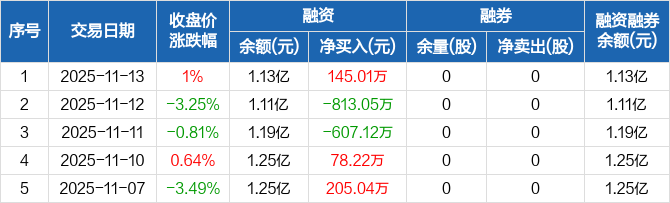 捷强装备:融资净买入145.01万元,融资余额1.13亿元(11-13)