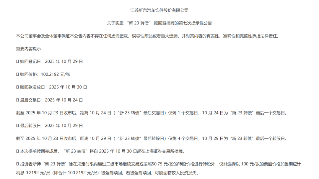 新泉股份发布关于实施 “新23转债” 赎回暨摘牌的第七次提示性公告,提醒投资者10月24日为新23转债最后一个交易日,10月29日是最后一个转股日,债券持有人应及时卖出或转股。10月29日收市后,未实施转股的新23转债将全部冻结,停止交易和转股。