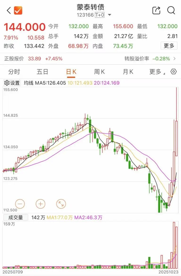 截至10月23日收盘,蒙泰转债、新23转债价格分别为144.000元/张和131.254元/张。对照各自的强赎价格,投资者若是未及时操作,或将分别亏损超29%和23%。截至目前,蒙泰转债、新23转债仍有0.55亿元和1.92亿元余额尚未完成交易或转股,所占比例分别超18%和16%。