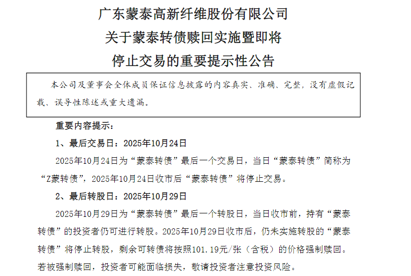 蒙泰高新发布关于蒙泰转债赎回实施暨即将停止交易的重要提示性公告,提醒投资者10月24日为蒙泰转债最后一个交易日,10月29日是最后一个转股日,债券持有人应及时卖出或转股。10月29日收市后,未实施转股的蒙泰转债将全部冻结,停止交易和转股。