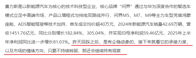 $赛力斯(SH601127)$是以新能源汽车为核心的技术科技型企业,核心品牌“问界”通过与华为深度合作的智选车模式立足中高端市场,产品以增程式与纯电双路线并行,问界M5、M7、M9等主力车型凭借鸿蒙座舱、ADS智能驾驶等技术加持,单车成交均价超40万元,2024年新能源汽车销量42.69万辆、营收1451.76亿元,同比分别增长182.84%、305.04%,并实现归母净利润59.46亿元,2025年上半年净利润同比进一步增长81.03%。今天的表现还算是不错的,但是并没有达到个人的理想预期,盘中一直震荡徘徊,柔软无力,参照人工智能来看,很明显已经偏离了轨道,所以在午后选择了浮盈出局,如果下周有好转的迹象,还是会考虑再次接回