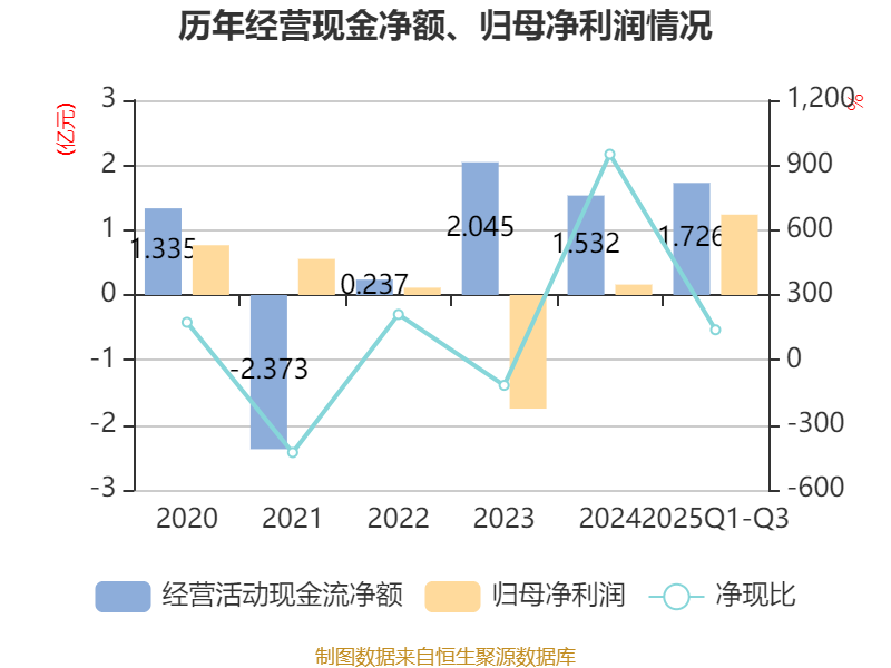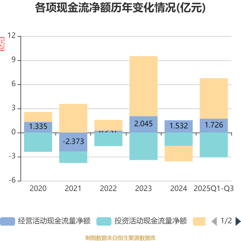 2025年前三季度,公司经营活动现金流净额为1.73亿元,同比下降61.8%;筹资活动现金流净额5.04亿元,同比增加6.73亿元;投资活动现金流净额-3.08亿元,上年同期为-1.63亿元。