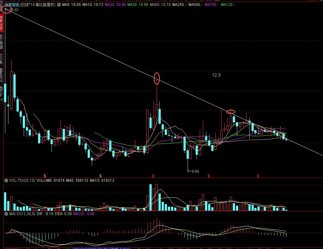 $迦南智能(SZ300880)$ 知道为什么股价越来越低吗?只有突破了这个下降趋势才能上涨