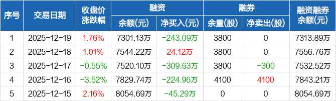 盛德鑫泰:融资净偿还243.09万元,融资余额7301.13万元(12-19)