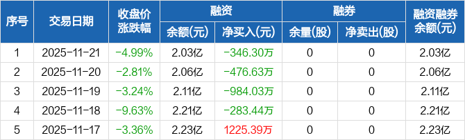 万胜智能融资融券信息显示,2025年11月21日融资净偿还346.3万元;融资余额2.03亿元,较前一日下降1.68%。
