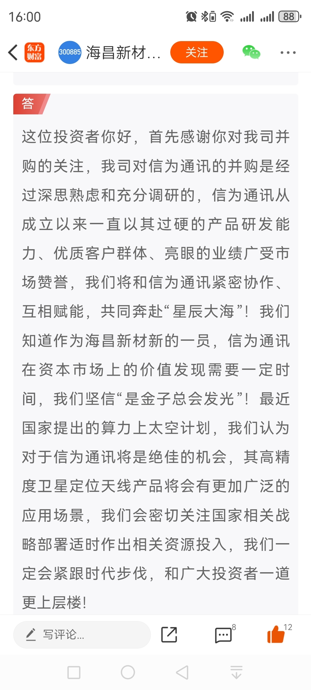 $海昌新材(SZ300885)$ 不说公司怎么样吧,就单单董秘来那是相当有理想,礼貌,并且给持股人信心!哪怕画饼你也吃的舒服呀 是金子总会发光,一起奔赴星辰大海!