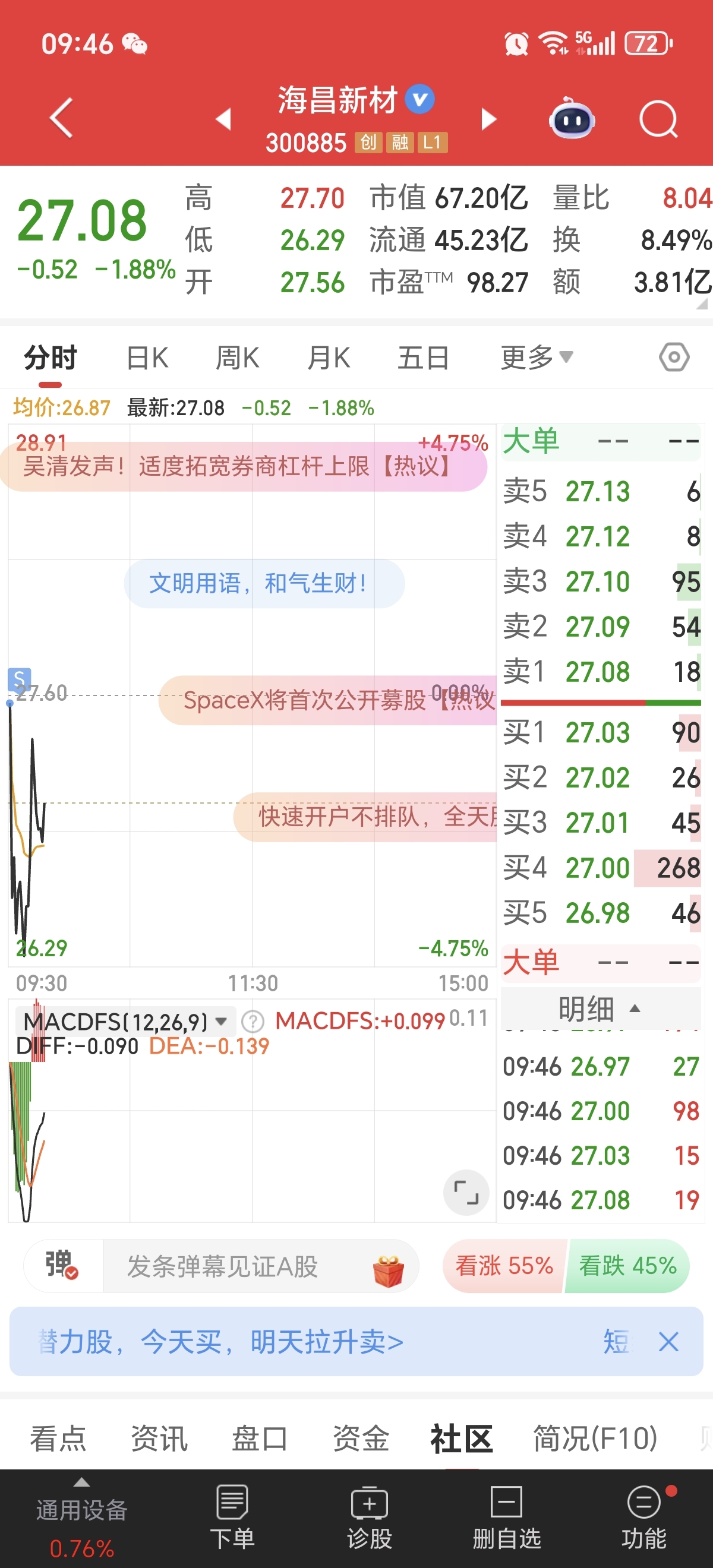 $海昌新材(SZ300885)$ 星期五出了一半 今天竞合竞价全走了 回调几天在接回来
