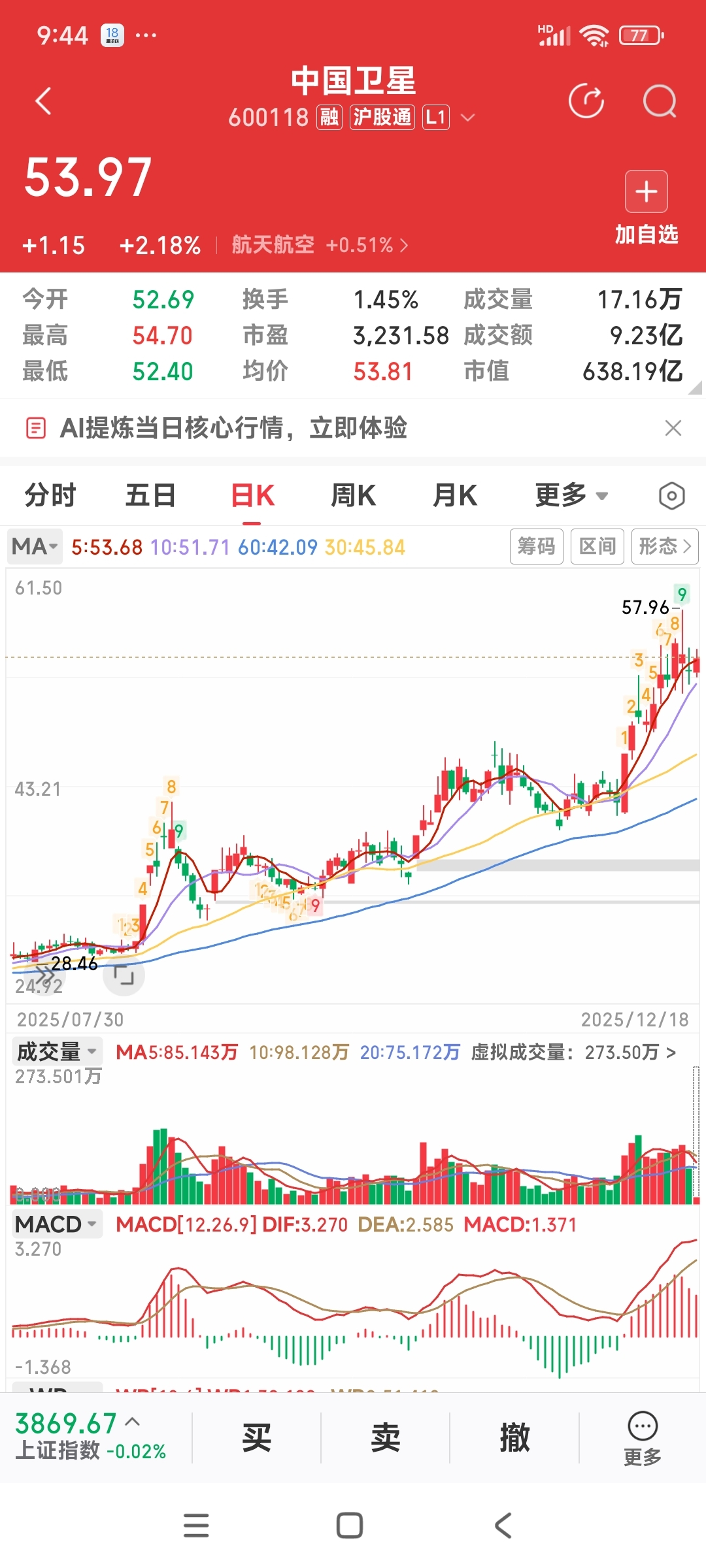 就算商业航天万年轮动一回跌7元最多的你该修复2个点了,否则再无人碰跌毫无意义!中国卫星53元红2.5% 就算商业航天万年轮动一回跌7元最多的你该修复2个点了,否则再无人碰跌毫无意义!中国卫星5日均线上根本横盘没跌53元红2.5%,你到底是啥?