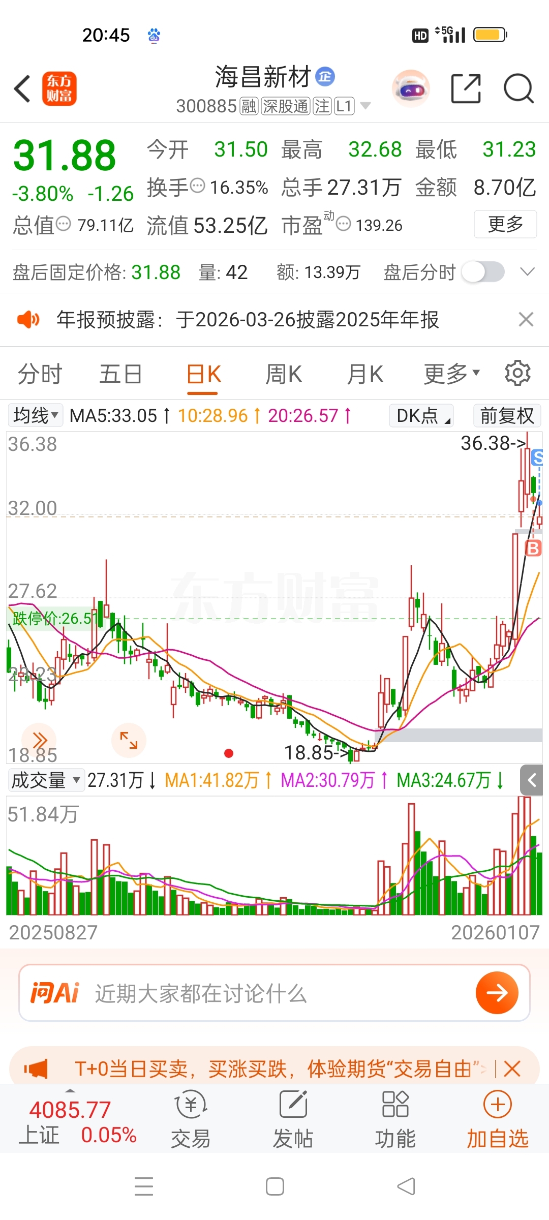 $海昌新材(SZ300885)$ 今买明卖,不及预期。再跌不买。