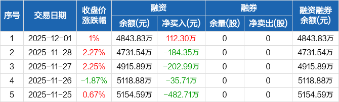 融资方面,当日融资买入322.01万元,融资偿还209.72万元,融资净买入112.3万元。融券方面,融券卖出0股,融券偿还0股,融券余量0股,融券余额0元。融资融券余额合计4843.83万元。
