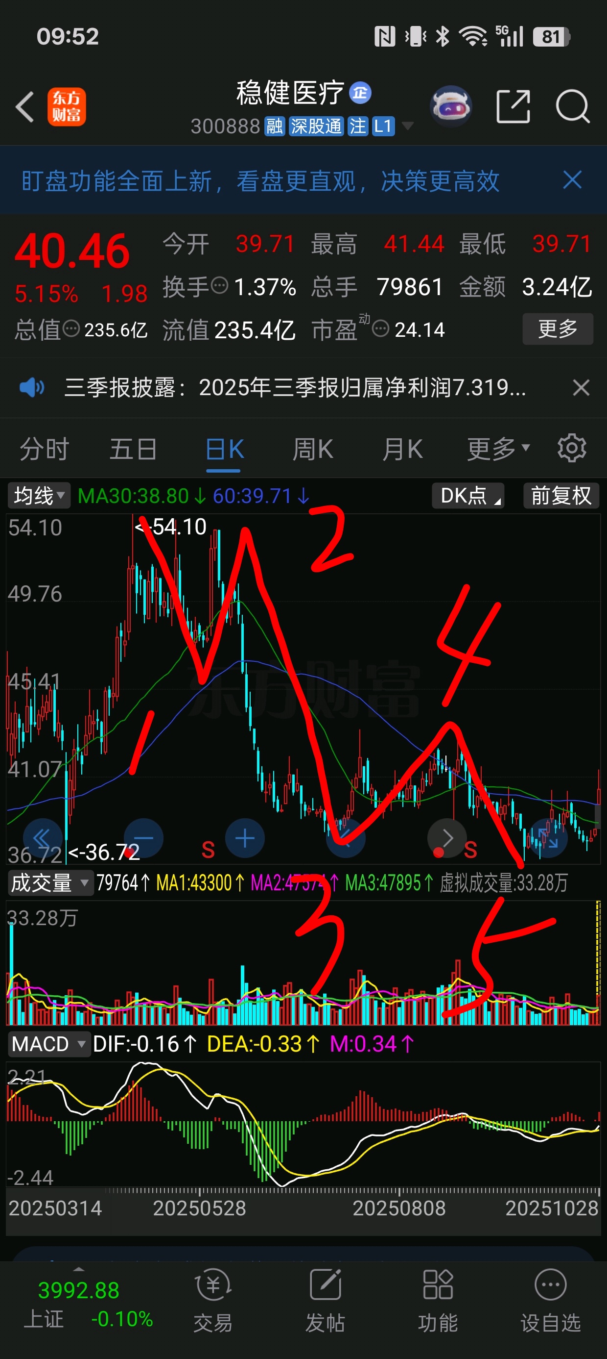 $稳健医疗(SZ300888)$ 从今年4月的54到现在经历了5段下跌,现在重新站上突破日线,希望能开启一波日线级别的上涨。