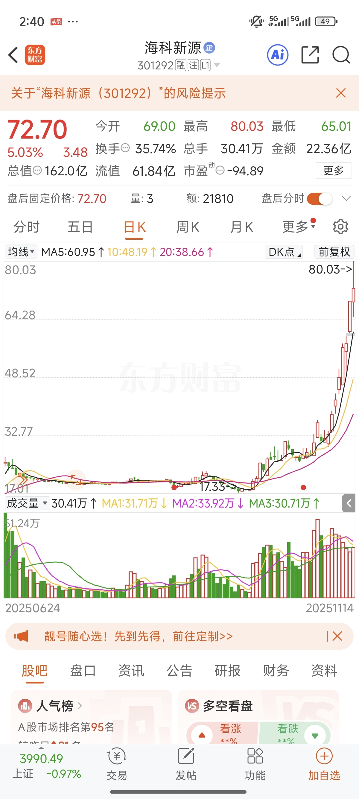 $翔丰华(SZ300890)$ 看看海科新源,9月底开始17块一把拉到70了,感觉今年十倍妖股就他了,对比翔丰华,越比越是一坨翔