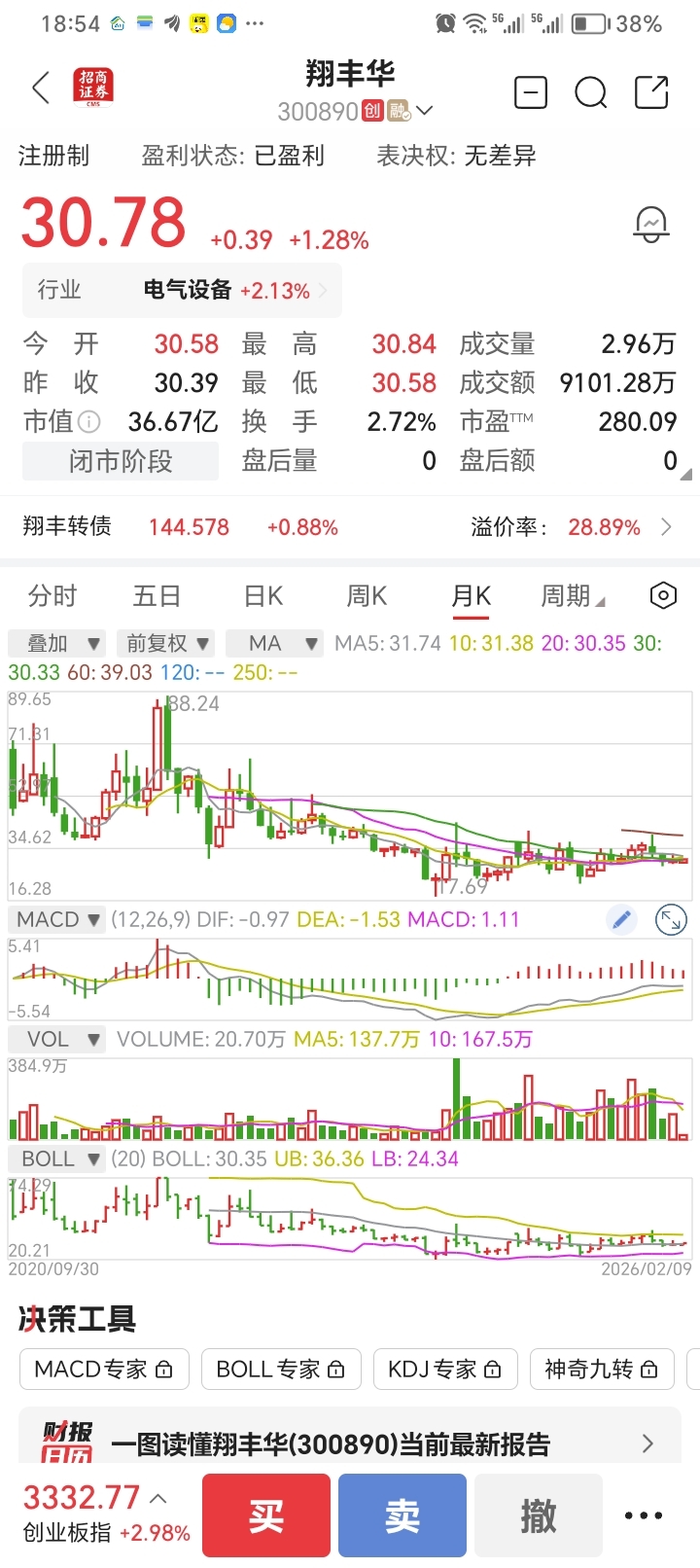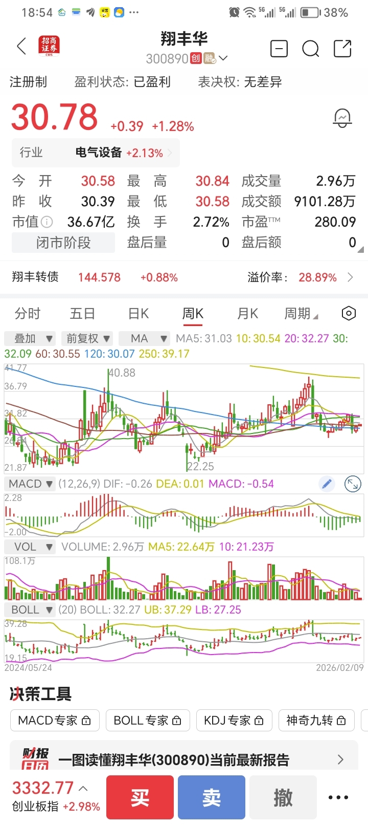 $翔丰华(SZ300890)$ 周线MACD经过上次第一次碰250周线及60月线共同压力位39元后巨烈下跌,目前还没有看到周线走强的任何迹象,周线调整了12周近3个月MACD绿柱仍没有收窄回零轴,黄白线也没有金叉,周线和月线5/10/20/30几乎全部贴合一起,量能持续降低,4-6周短时间看不到任何可以乐观的地方。3-6个月长期来看,也许仍然有机会往39元附近,可能也许还是逃跑机会,深套5年60个月太难受了,年难过。。。