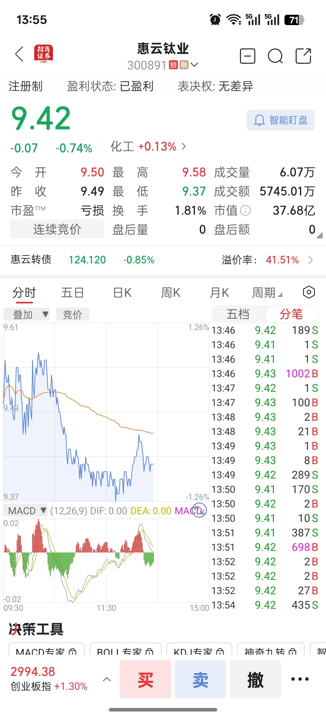 $惠云钛业(SZ300891)$ 13:52一13:54,两分钟没成交,刚刚一笔一千手一笔六百手买单把卖方砸蒙了?然后赶紧4百多手砸盘下来,就怕资金抱团拉?