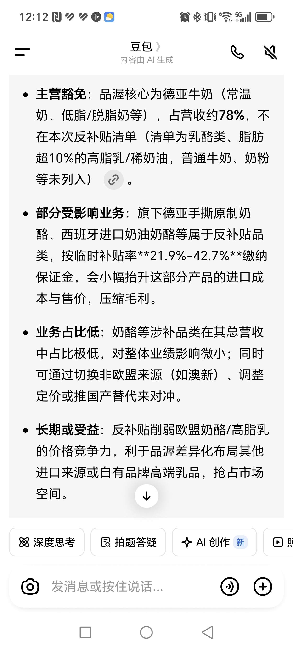 - 部分受影响业务:旗下德亚手撕原制奶酪、西班牙进口奶油奶酪等属于反补贴品类,按临时补贴率**21.9%-42.7%**缴纳保证金,会小幅抬升这部分产品的进口成本与售价,压缩毛利。