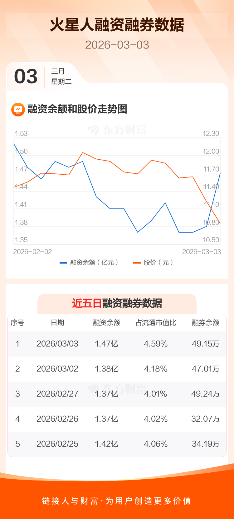 交易所最新数据显示,火星人于2026年3月3日获融资买入1354.98万元,融资偿还495.17万元,当日融资净买入859.81万元。目前,该股融资余额1.47亿,占流通市值比例为4.59%。